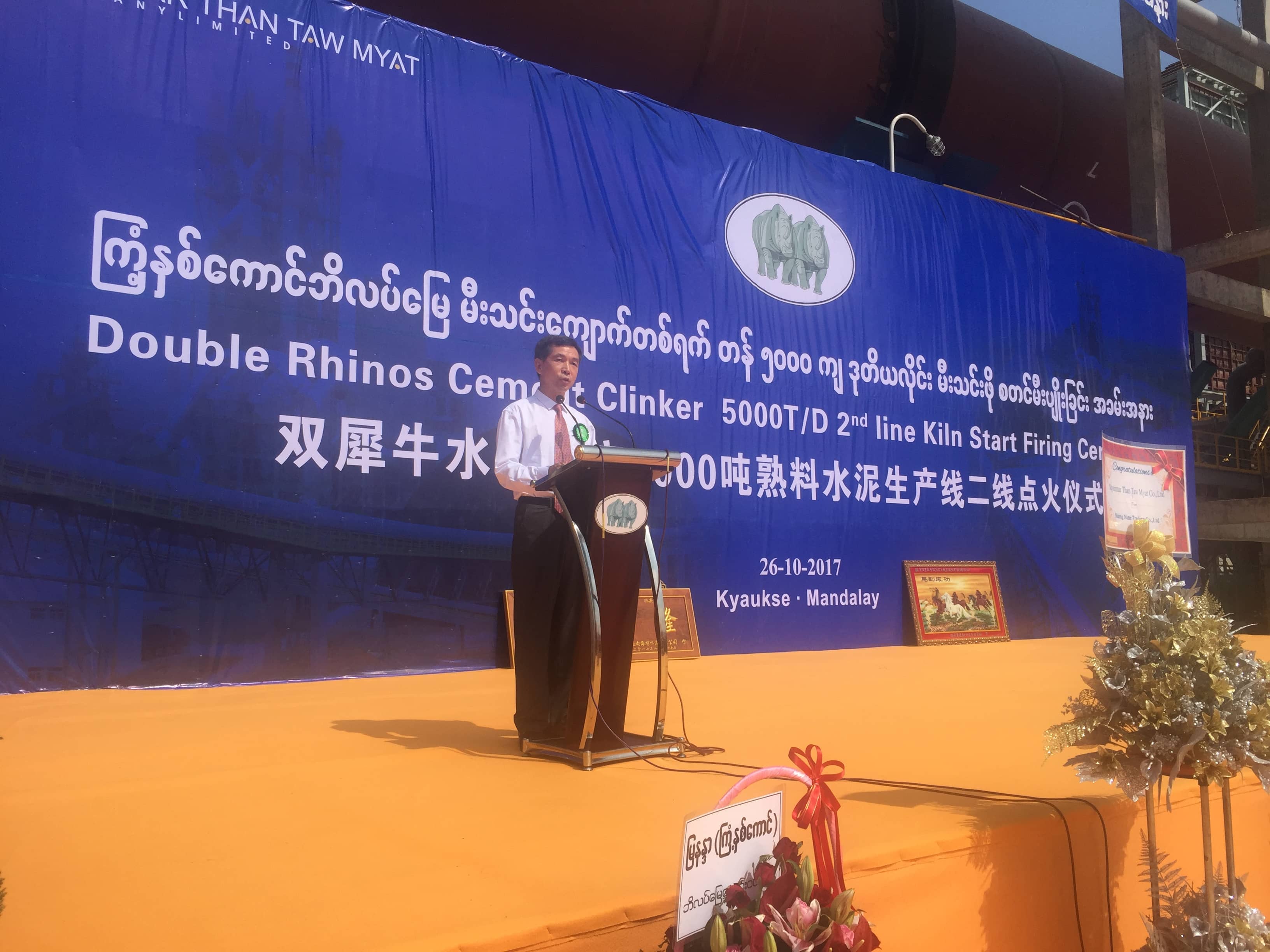 10月26日上午,王宗穎總領事赴皎施縣出席旦多淼雙犀牛水泥日產5千噸熟料水泥生產線二線點火儀式并致辭。該項目由云南建盛投資有限公司與緬甸合作伙伴合資,由中材國際緬甸公司承建。