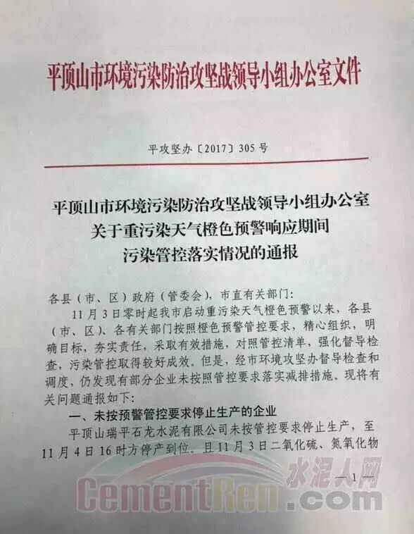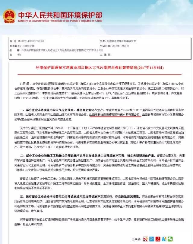 環境保護部11月6日通報京津冀及周邊地區大氣污染防治強化督查情況中通報了山西省長治市南耀集團科保水泥有限公司在所屬區域啟動重污染天氣應急預案后仍未停產。