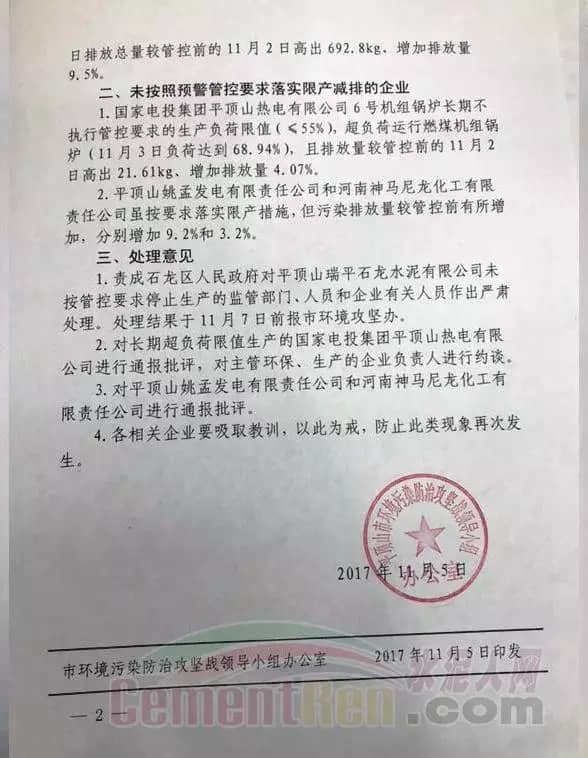 無獨有偶,平頂山市環境污染防治攻堅戰領導小組辦公室日前通報了在11月3日零時啟動重污染天氣橙色預警以后各縣(市、區)未按照管控要求落實減排措施的企業和相關問題文件中稱:平頂山瑞平石龍水泥有限公司未按管控要求停止生產,11月4日16時方停產到位。11月3日二氧化硫、氮氧化物日排放總量較管控前的11月2日高出692.8kg,增加排放量9.5%。