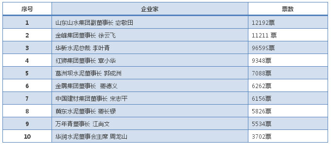 借此時機,水泥行業知名媒體水泥內參積極響應國家號召,發起“誰是水泥行業最具影響力的企業家”投票,得票前十名企業家如下: