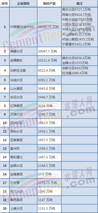 中國水泥熟料產能前二十強