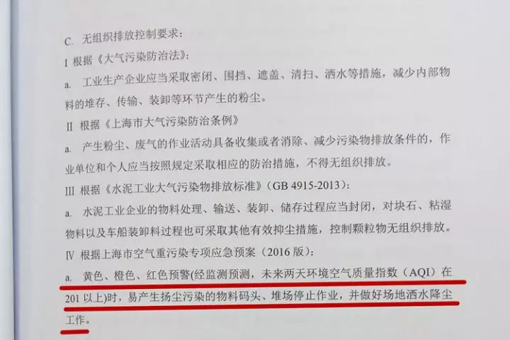 此外,上海在核發的排污許可證中,還注重過程監管,而非“一發了之”,創新增設了冬季不利氣象條件等特殊時期的環境管理要求——未來兩天,環境空氣質量指數在201以上時,水泥行業的物料碼頭、堆場容易產生粉塵,要停止作業,并做好曬水降塵。