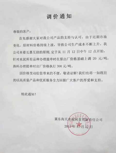 冀東海天水泥聞喜有限責任公司調價通知:由于近期市場變化,原材料價格持續上漲,導致公司生產成本不斷上升。本著互惠互助的原則,定于11月12日中午12點開始針對水泥所有品種辦理提單時在原出廠價格基礎上上調20元/噸,熟料辦理提單時出廠價格執行300元/噸。
