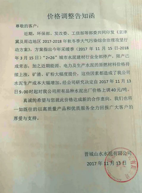 晉城山水水泥提價通知:近期,環保部、發改委、工信部等部委共同印發《京津冀及周邊地區2017-2018年秋冬季大氣污染綜合治理攻堅行動方案》,方案指出今年采暖季(2017年11月15日-2018年3月15日)“2+26”城市水泥建材行業全部停產,限產已成常態,加之近期能源、電力及生產水泥的原燃料材料價格持續上漲,礦渣、礦粉大幅度提價,這些因素都造成了我公司水泥生產成本大幅增加。經公司決定自2017年11月13日9點對公司所有品種水泥出廠價格上調40元/噸。