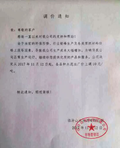 臨汾山水水泥有限公司提價通知:由于當前的環保形勢、行業錯峰生產及各類原燃格上漲等因素,導致我公司生產成本大幅增加,為確保公司正常生產運行,繼續為客戶提供優質的產品和服務,公司決定從2017年11月12日起,各品種水泥出廠價上調10元/噸。