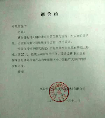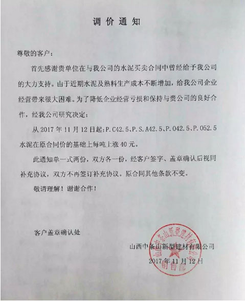 山西中條山新型建材有限公司提價通知:由于近期水泥及熟料生產成本不斷增加,給企業經營帶來很大困難。為了降低企業經營虧損和保持與客戶的良好合作,經研究決定從11月12日起對各品種水泥在原合同價的基礎上每噸上漲40元。