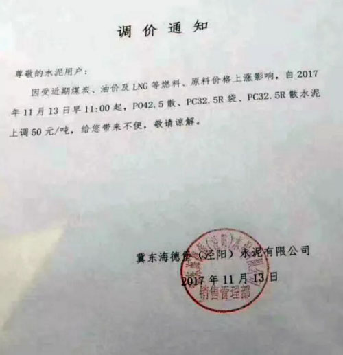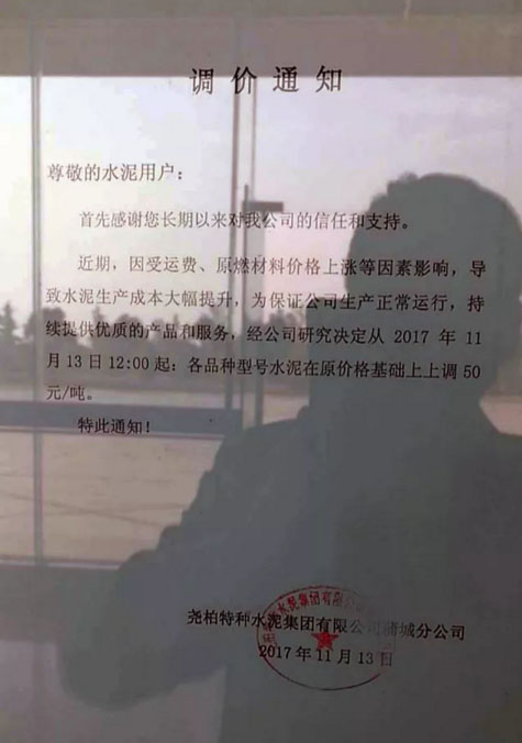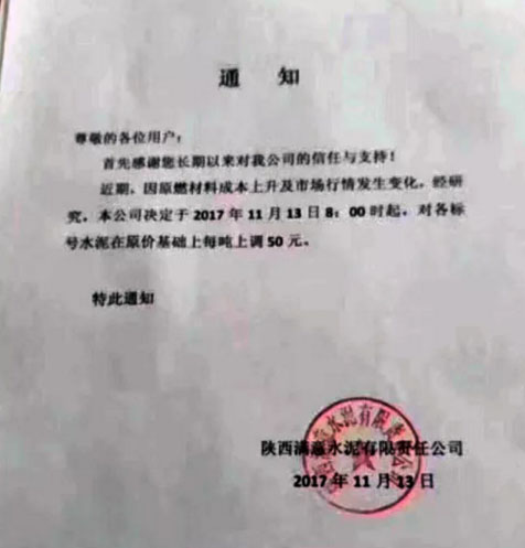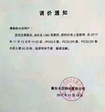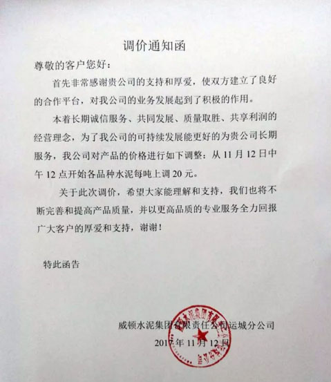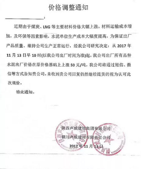 陜西聲威建材集團有限公司銅川聲威建材有限責任公司提價通知:由于近期煤炭、LNG等主要材料價格大幅上漲,材料運輸成本增加及環保等因素影響,水泥單位生產成本大幅度提高,為保證出廠產品質量,維持公司生產正常運行,經研究決定,從2017年11月13日早10點起所有品種水泥出廠價格在原價格基礎上上漲50元/噸。