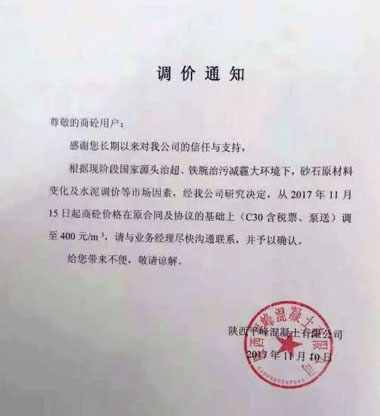 陜西平峰混凝土有限公司提價通知:根據現階段國家源頭治超、鐵腕治污減霾大環境下,砂石原材料變化及水泥調價等市場因素,經公司研究決定從2017年11月15日起商砼價格在原合同及基礎上(C30含稅票、泵送)調至400元/立方。