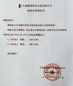 天瑞集團鄭州水泥有限公司銷售價格通知:根據當前市場,結合公司銷售實際,經研究決定水泥銷售價格自2017年11月13日起調整為:P.O42.5袋裝510元/噸;P.O42.5散裝480元/噸。