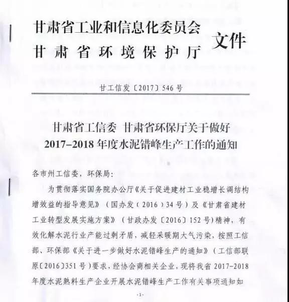 【水泥人網】近日,甘肅省工信委、環保廳聯合發布《關于做好2017-2018年度水泥錯峰生產工作的通知》(以下簡稱“通知”)。通知要求,自2017年11月1日起至2018年3月15日,各市州工信部門嚴格按照市州政府2017—2018年大氣污染冬防工作方案要求,督促企業認真執行相關法律法規和強制性標準,強化對企業環保設施運行情況檢查,加大技術改造力度,在錯峰生產期間統籌做好生產線技術改造,設備檢修等工作,著力改善生產環境,實現達標排放。