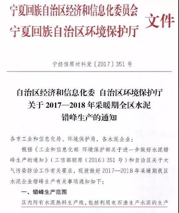 11月13日,寧夏回族自治區經信委、環保廳聯合發布了《自治區經濟和信息化委自治區環境保護廳2017-2018年采暖期全區水泥錯峰生產的通知》(以下簡稱“通知”)。通知要求,通知文件要求自治獲內所有水泥熟料生產線,包括利用電石渣生產水泥的生產線都應進行錯峰生產。錯峰時間自2017年12月10至2018年3月20日。