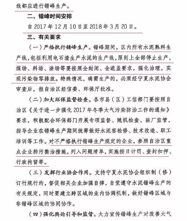 通知文件要求,錯峰生產期間,自治區內所有水泥熟料生產線(包括利用電石渣生產水泥的生產線),原則上全部停止生產,煤場、料場、渣場等要按照全封閉、全遮蓋要求,強化治理,實現污染物零排放。對不嚴格執行錯峰生產規定的企業,參照自治區重點企業排污整治措施,列入問題清單,實施按日計罰、查封扣押、行政拘留等。通知原文如下:
