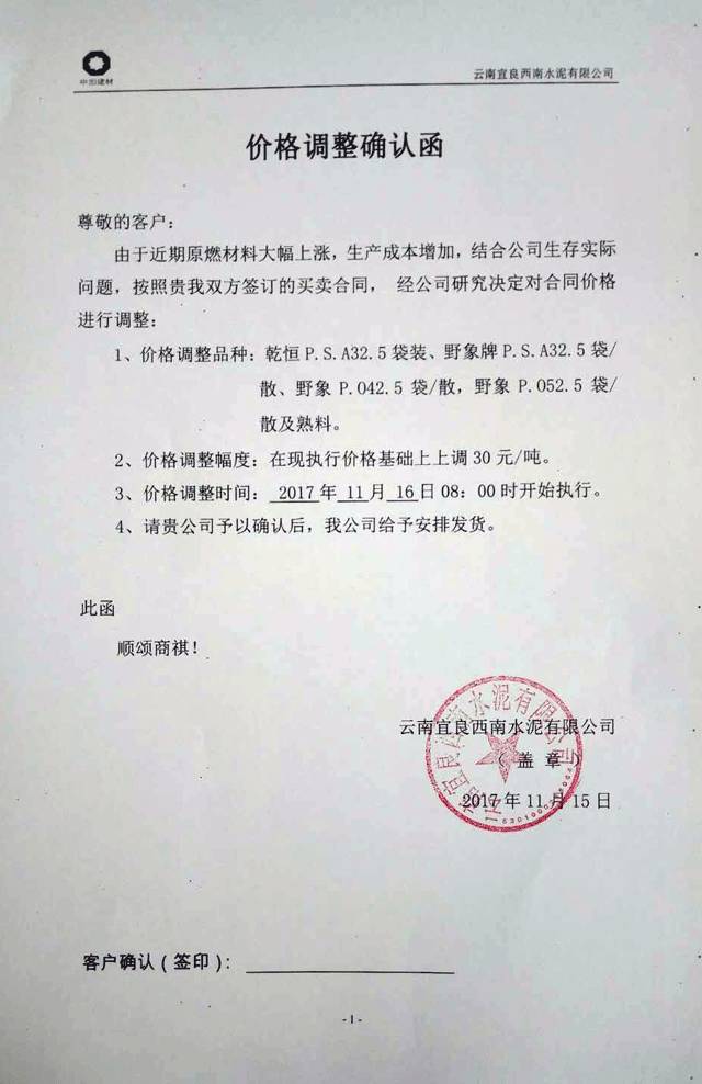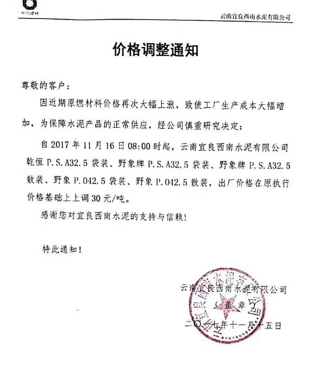 自2017年11月16日8時起,云南宜良西南水泥有限公司乾恒P.S.A32.5袋裝、野象牌P.S.A32.5袋裝、野象牌P.S.A32.5散裝、野象P.O42.5袋裝、野象P.O42.5散裝。出廠價格在原執行價格基礎上上調30元/噸。