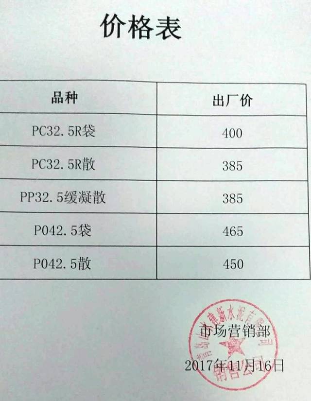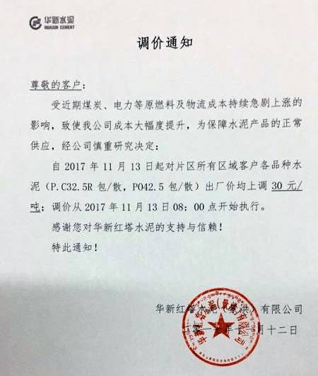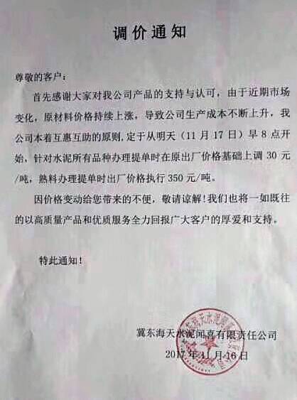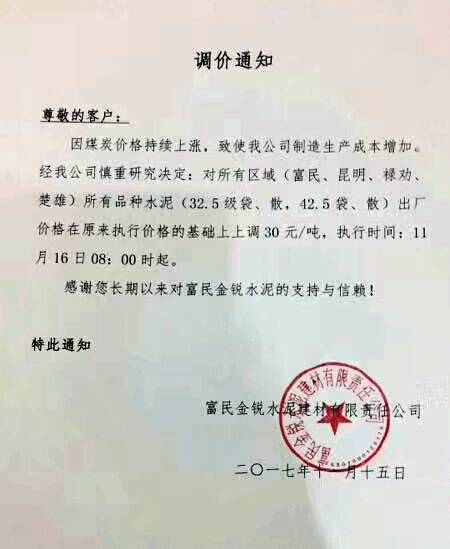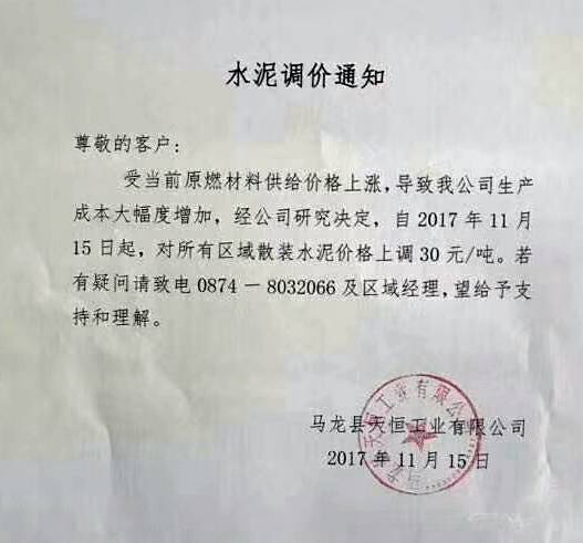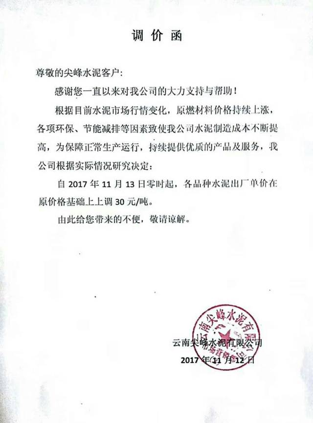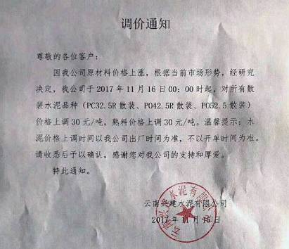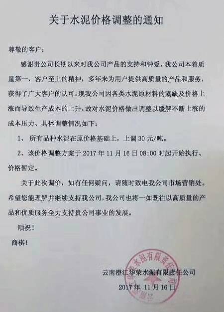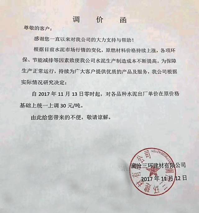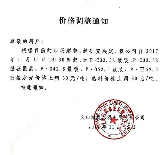 根據目前水泥市場行情變化,原燃材料價格持續上漲,各項環保、節能減排等因素致使我公司水泥制造成本不斷提高,為保障正常生產運行,持續提供優質的產品及服務,公司根據實際情況研究決定,自2017年11月13日零時起,各品種水泥出廠單價在原價格基礎上上調30元/噸