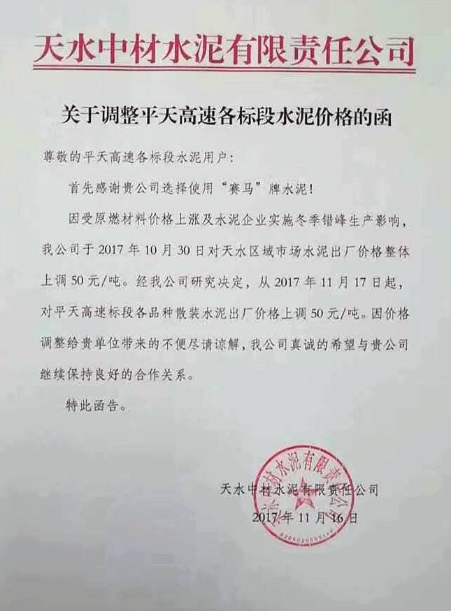 由于受原燃材料價格大幅上漲和水泥企業錯峰生產的影響,公司已于2017年10月30日對天水區域市場各品種水泥出廠價格上調50元/噸。經研究決定從2017年11月17日起,對平天高速各用戶各品種水泥出廠價格上調50元/噸。