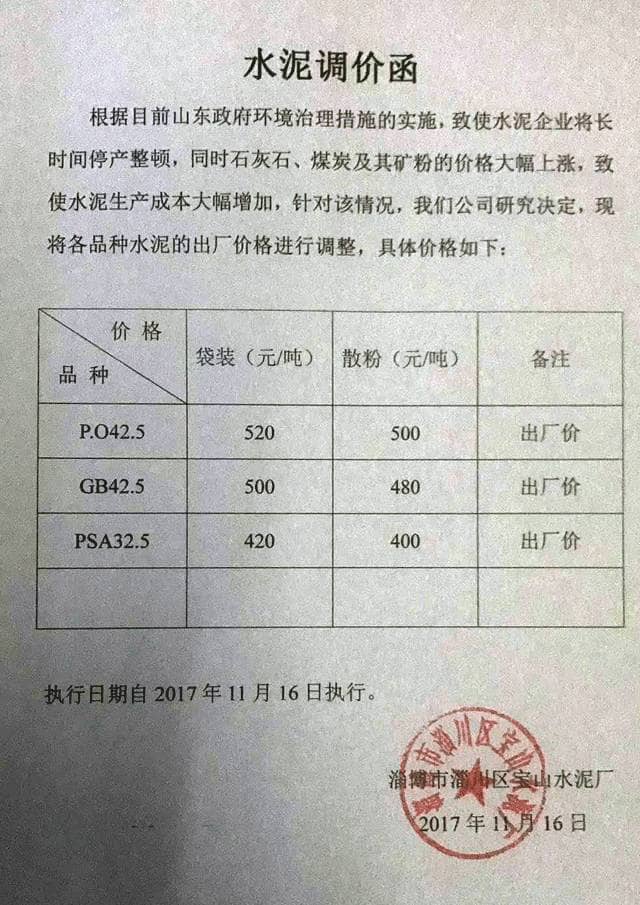 根據目前山東政府環境治理措施的實施,致使水泥企業將長時間停產整頓,同時石灰石、煤炭及其礦粉的價格大幅上漲,致使水泥生產成本大幅增加,針對該情況,公司研究決定將各品種水泥的出廠價格進行調整 。