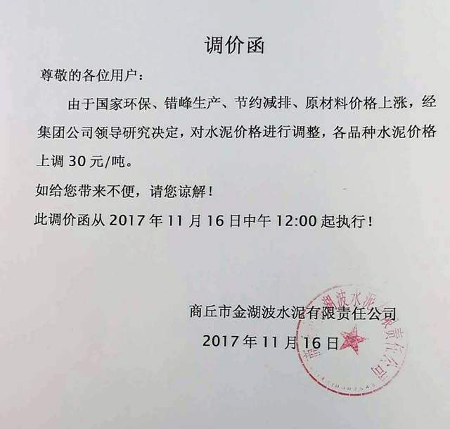 根據目前水泥市場行情的變化,原燃材料價格持續上漲,各項環保、節能減排等因素致使公司水泥生產制造成本不斷提高。為保障生產正常運行,持續為廣大客戶提供優質的產品及服務,公司根據實際情況研究決定:自2017年11月13日零時起,對各品種水泥出廠單價在原價格基礎上統一上調30元/噸。