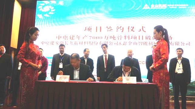 10月底,在臺兒莊古城隆重召開的“高效節能綠色環保砂石骨料高峰論壇暨院士工作站啟動典禮及項目簽約儀式”上,中電建安徽長九新材料股份總經理肖光彩與鑫金山機械董事長孫中巖舉行了簽約儀式。筆者注意到,接過對方簽約函的那一瞬間,孫中巖的眼神充滿欣喜,表情自信而堅定。