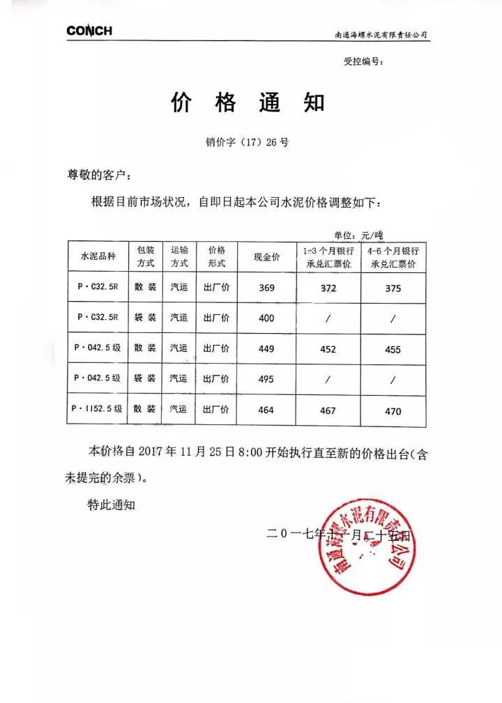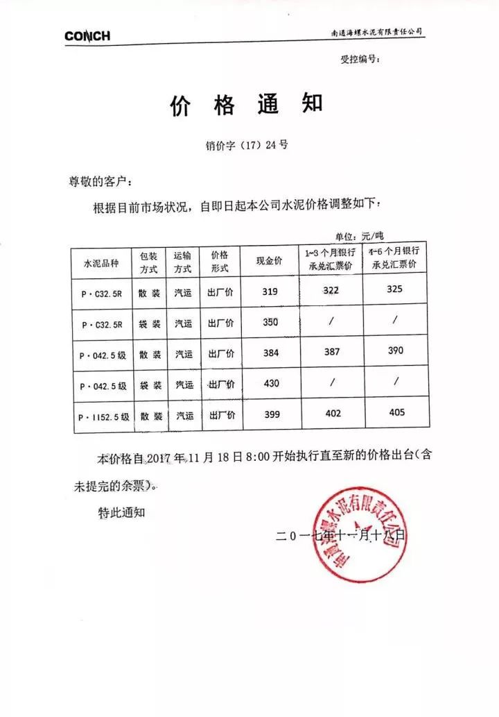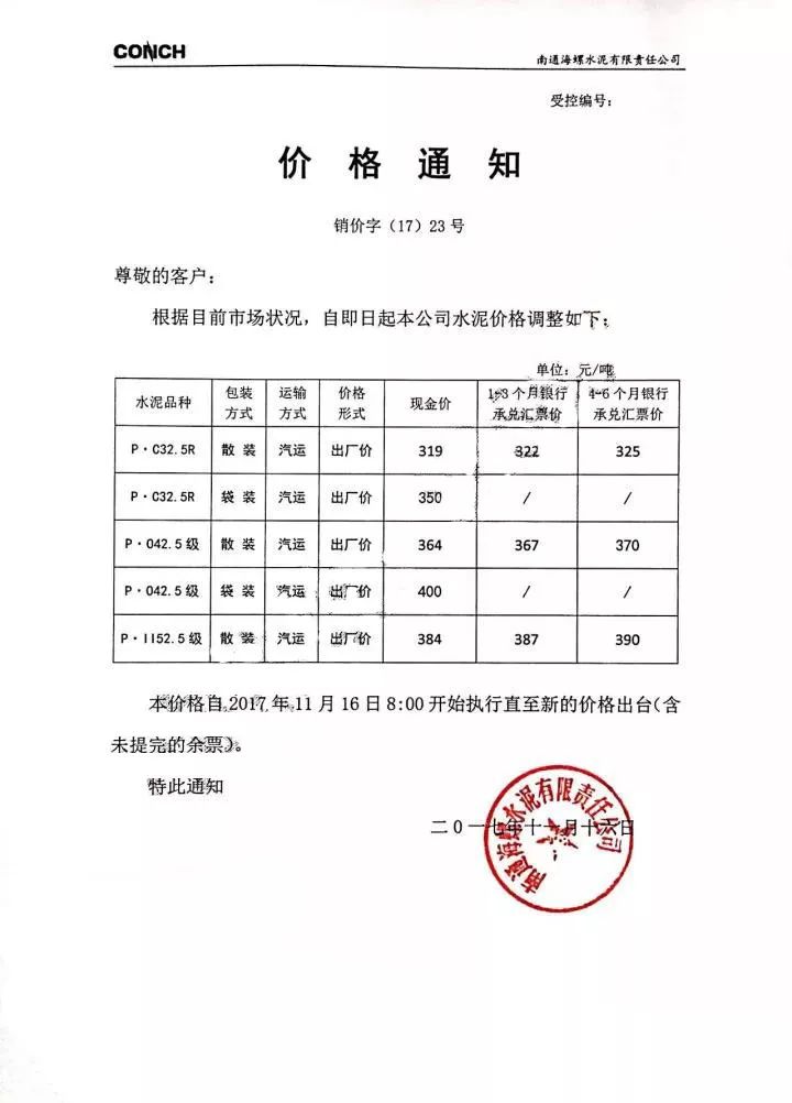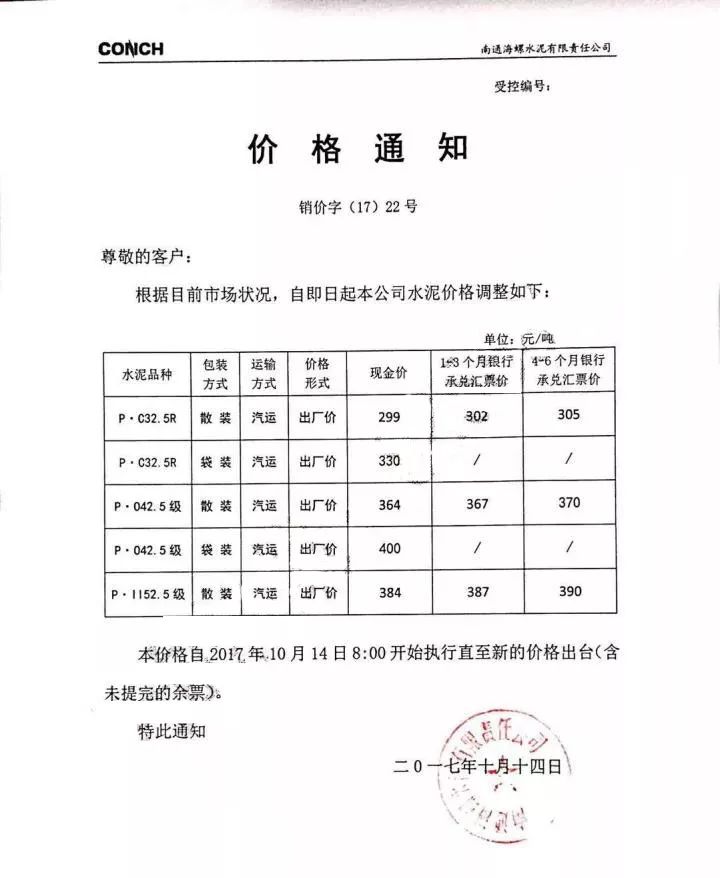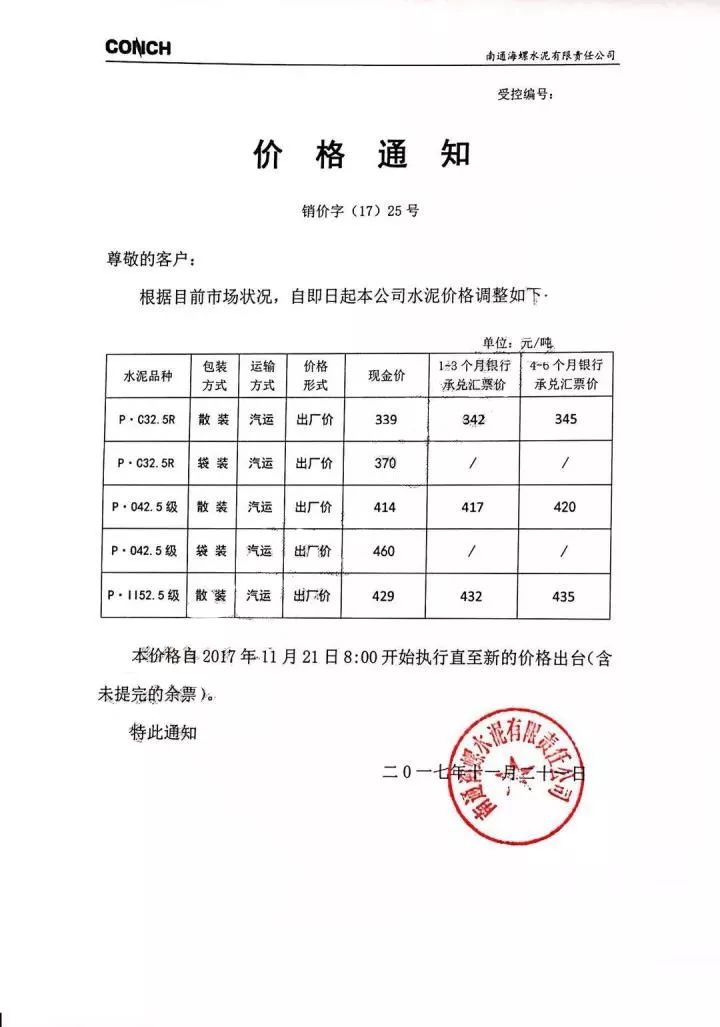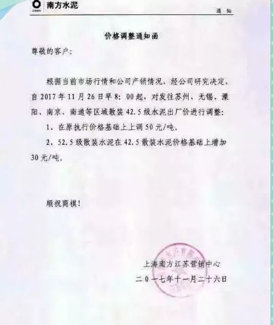 南通海螺水泥漲價函