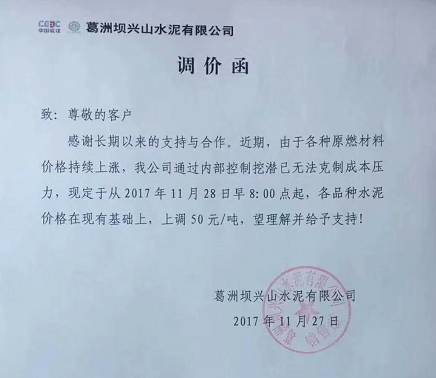 2017年11月28日早8:00起,各品種水泥在原價格基礎上,上調50元/噸。
