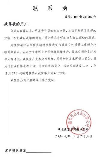 2017年11月27日起,將對散裝水泥價格上調60元/噸。
