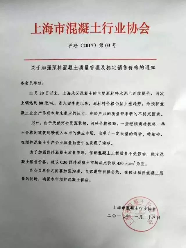 今年這一年水泥漲價(jià),混凝土行業(yè)也并不平靜。9月15日,無(wú)錫34家混凝土企業(yè)聯(lián)合發(fā)告用戶書(shū),通知從2017年9月15日開(kāi)始,普通C30混凝土保本價(jià)為400元每方,軌道、高架等重點(diǎn)項(xiàng)目的價(jià)格在此基礎(chǔ)上增加30元每方。