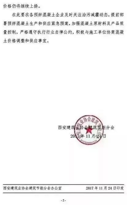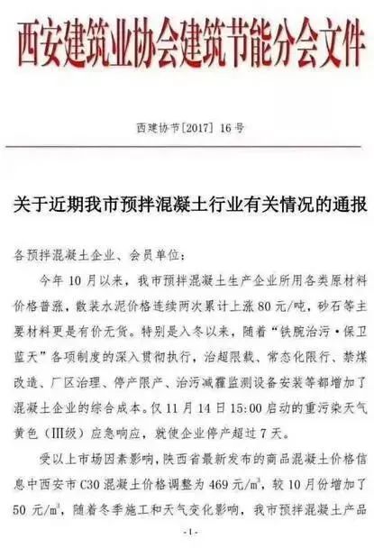 此前西安建筑業(yè)協(xié)會(huì)建筑節(jié)能分會(huì)曾發(fā)布關(guān)于近期西安預(yù)拌混凝土行業(yè)有關(guān)情況的通報(bào),通報(bào)稱(chēng),今年10月以來(lái),西安市預(yù)拌混凝土生產(chǎn)企業(yè)所用各類(lèi)原材料價(jià)格普漲,散裝水泥價(jià)格連續(xù)兩次累計(jì)上漲80元/噸,砂石等主要材料更是有價(jià)無(wú)貨。特別是入冬以來(lái),隨著“鐵腕治污,保衛(wèi)藍(lán)天”各項(xiàng)制度的深入貫徹執(zhí)行,治超限載,常態(tài)化限行、禁煤改造,廠區(qū)治理,停產(chǎn)限產(chǎn)、治污減霾監(jiān)測(cè)設(shè)備安裝等都增加了混凝土企業(yè)的綜合成本。僅11月14日15:00啟動(dòng)的重污染天氣黃色應(yīng)急響應(yīng),就使企業(yè)停產(chǎn)超過(guò)七天。