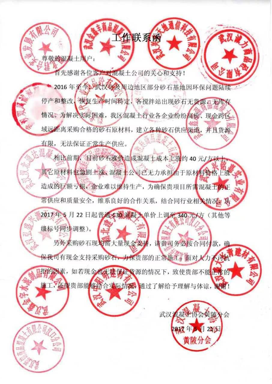 今年五月份的時(shí)候,武漢混凝土協(xié)會(huì)黃陂分會(huì)就曾發(fā)布工作聯(lián)系函,聯(lián)系函稱(chēng),2016年至今,武漢市及周邊地區(qū)部分砂石基地因環(huán)保問(wèn)題陸續(xù)停產(chǎn)和整改,恢復(fù)生產(chǎn)時(shí)間待定,各攪拌站出現(xiàn)砂石無(wú)貨源,無(wú)庫(kù)存情況。為解決實(shí)際困難,區(qū)混凝土行業(yè)各企業(yè)紛紛高價(jià)、現(xiàn)金跨區(qū)域遠(yuǎn)距離采購(gòu)合格的砂石原材料,建立各種砂石供應(yīng)渠道,并且貨源有限,無(wú)法保證正常生產(chǎn)供應(yīng)。