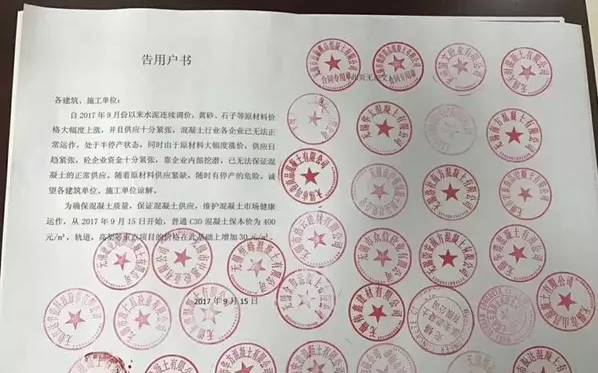 告用戶書(shū)表示,自2017年9月份以來(lái),水泥連續(xù)系調(diào)價(jià),黃砂、石子等原材料價(jià)格大幅度上漲,并且供應(yīng)十分緊張,混凝土行業(yè)各企業(yè)已無(wú)法正常運(yùn)作,處于半停產(chǎn)狀態(tài),同時(shí)由于原材料大幅度漲價(jià),供應(yīng)日趨緊張,混凝土企業(yè)資金十分緊張,靠企業(yè)內(nèi)部挖潛,已無(wú)法保證混凝土的正常供應(yīng)。隨著原材料供應(yīng)緊缺,隨時(shí)有停產(chǎn)的危險(xiǎn),希望各建筑、施工單位諒解。