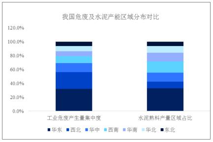 區域分布與危廢產區高度匹配:水泥在是傳統意義上的“短腿”產品,業內普遍認為其經濟銷售半徑為公路<300公里、鐵路<500公里。因此水泥產能的密度與當地經濟發展水平和基建需求直接相關。同時,危廢來自工業生產過程,同樣與經濟發展水平相關。如下圖所示,水泥產能分布與危廢產量分布情況區域匹配度整體較高。因此,水泥窯協同處置工藝的區域適用性較強,適于在全國范圍內推廣,作為普適的協同處置技術,填補全國各地傳統危廢產能供需缺口。