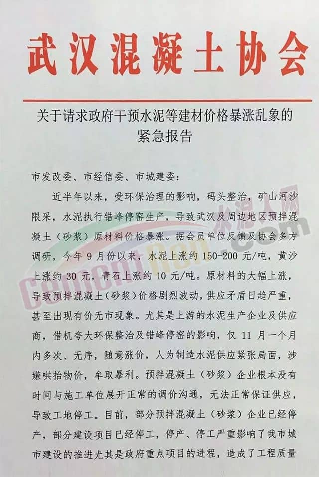 報告稱,近半年以來,受環(huán)保治理的影響,碼頭整治、礦山河沙限采,水泥執(zhí)行錯峰停窯生產,導致武漢及周邊地區(qū)預拌混凝土(砂漿)原材料價格暴漲。