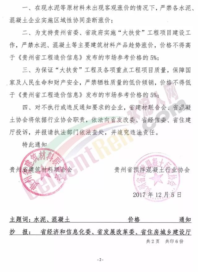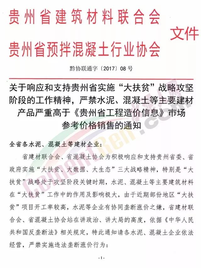 昨日(5日)貴州省建筑材料聯(lián)合會,貴州省預拌混凝土行業(yè)協(xié)會發(fā)布《關于響應和支持貴州實施”大扶貧“戰(zhàn)略攻堅階段的工作精神,嚴禁水泥、混凝土等主要建材產品嚴重高于《貴州省工程造價信息》市場參考價格銷售的通知。通知稱:省建材聯(lián)合會、省混凝土協(xié)會為積極響應和支持貴州省委、省政府實施“大扶貧、大數(shù)據(jù)、大生態(tài)”三大戰(zhàn)略精神,特別是“大扶貧”戰(zhàn)略處于攻堅階段關鍵時期,水泥、混凝土等主要建筑材料在“大扶貧”工作中的作用及影響極大,由于近期部分地區(qū)“大扶貧”項目開工率較高,水泥等企業(yè)有協(xié)同壟斷漲價之嫌,省建材聯(lián)合會、省混凝土協(xié)會站在講政治、講大局的高度,依據(jù)《中華人民共和國反壟斷法》相關規(guī)定通知各水泥‘混凝土企業(yè)依法經營,嚴禁實施違法壟斷漲價行為。
