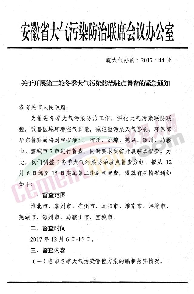此前安徽省曾發文通知自2017年11月23日起至2018年1月31日對淮北、亳州、宿州、蚌埠、阜陽、淮南、安慶七市實施駐點督查,對其余各市開展機動式巡查暗訪。