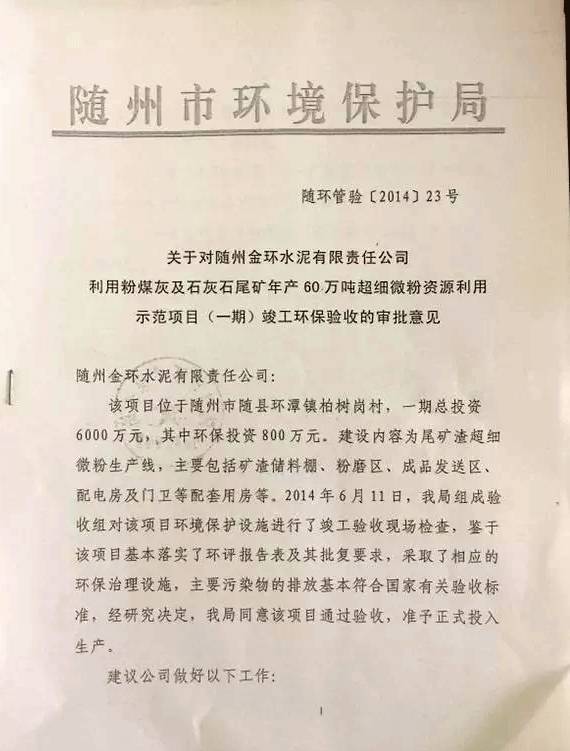 下圖為隨州市環(huán)保局對該項目的竣工環(huán)保驗收文件復(fù)印件。