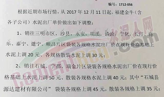 福建金牛水泥有限公司進入12月份已陸續幾次發布提價通知,全面調整各區域出貨價格。各品種水泥上調幅度在20-40元/噸左右。