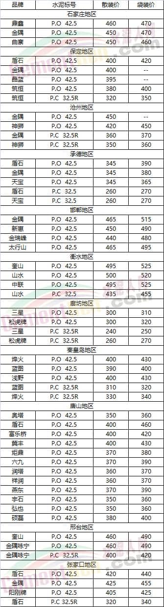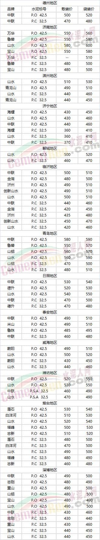 山東省部分地區水泥參考價