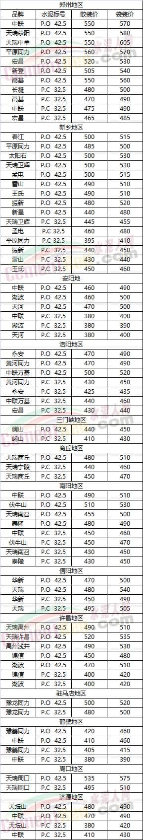 河南省部分地區水泥市場參考價