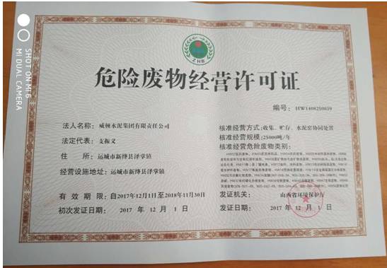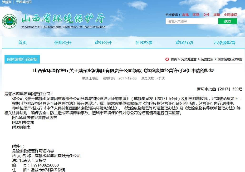 12月8日山西省環保廳在其官網上公開公布了關于威頓水泥集團有限責任公司領取《危險廢物經營許可證》申請的批復。