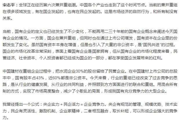 【水泥人網】“近幾年來,無論是學術界還是社會上,時而有人提‘國進民退’。近來,又有這樣的說法傳出,但實際數據表明,民企發展得很快,民營經濟占國民經濟的比重已經超過60%。通過混合所有制改革,國企和民企也已經是你中有我、我中有你的狀態。”近日,中國建材集團有限公司董事長、黨委書記宋志平接受記者專訪時表示,“國進民退”的說法沒有依據,“國民共進”才是事實。