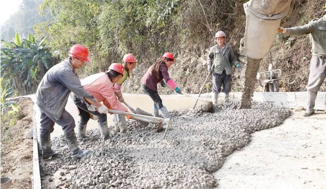 雖是寒冬,修路的工地卻是熱火朝天,老百姓對修路非常熱情,板弄村的村民們?nèi)砍鰟樱鲃恿x務(wù)幫忙挖路基和進(jìn)行攤鋪。一邊是修路的熱情,一邊卻是水泥供應(yīng)的困難。