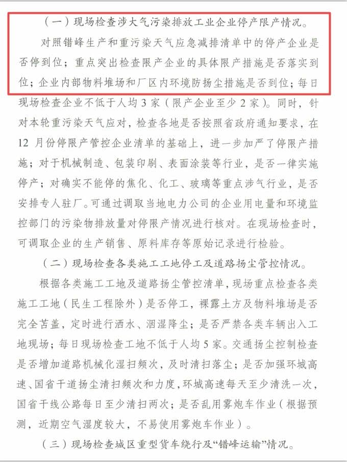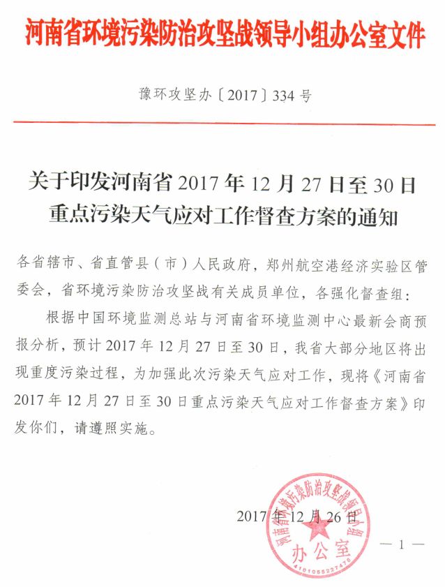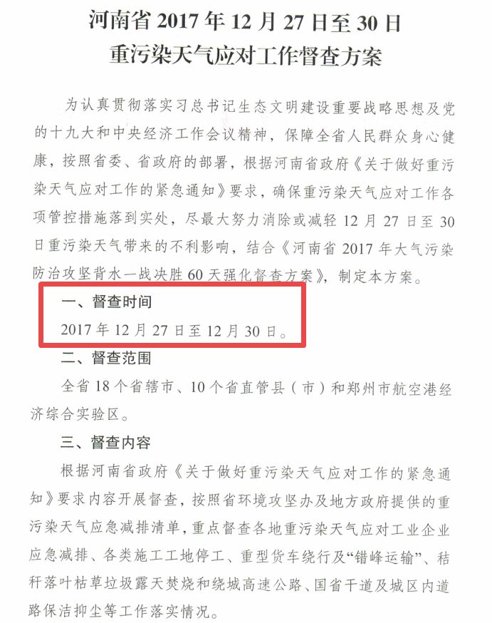【水泥人網(wǎng)】近日,河南省發(fā)布文件,根據(jù)中國(guó)環(huán)境監(jiān)測(cè)總站與河南省環(huán)境監(jiān)測(cè)中心最新會(huì)商預(yù)報(bào)分析,預(yù)計(jì)2017年12月27日至30日,我省大部分地區(qū)將出現(xiàn)重污染過程,為加強(qiáng)此次污染天氣應(yīng)對(duì)工作,將對(duì)全省18個(gè)省轄市、10個(gè)省直管縣(市)和鄭州市航空港經(jīng)濟(jì)綜合試驗(yàn)區(qū)進(jìn)行為期三天的督查,督查的主要內(nèi)容是檢查涉大氣污染排放工業(yè)企業(yè)停產(chǎn)限產(chǎn)情況,對(duì)錯(cuò)峰生產(chǎn)和重污染天氣應(yīng)急減排清單中的停產(chǎn)企業(yè)是否停到位,對(duì)限產(chǎn)企業(yè)的具體限產(chǎn)措施是否落實(shí),對(duì)各類工地施工、重型貨車?yán)@行及錯(cuò)峰運(yùn)輸?shù)取>唧w督查文件如下:
