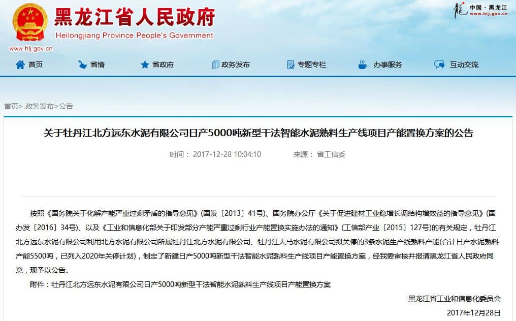 【水泥人網】昨日(28日)黑龍江省工信委公布了牡丹江北方遠東水泥有限公司日產5000噸新型干法智能水泥熟料生產線項目產能置換方案,并在當地政府官網公告。