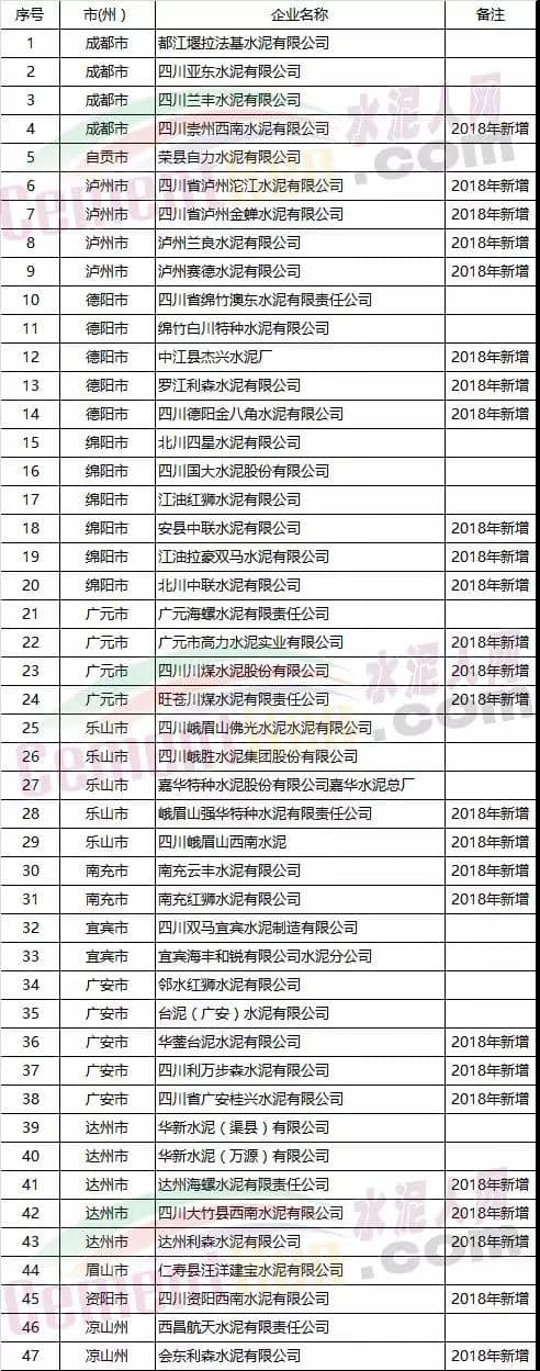 2018年四川省擬納入電力直接交易用戶水泥企業名單