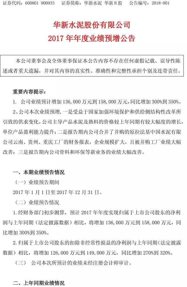【水泥人網(wǎng)】華新水泥(600801)11日晚發(fā)布業(yè)績預(yù)告,預(yù)計2017年凈利同比將增加13.6億元到15.8億元,同比增加300%到350%。