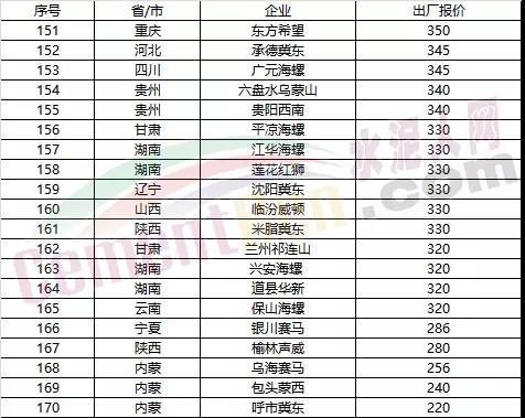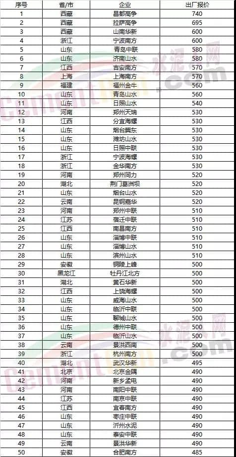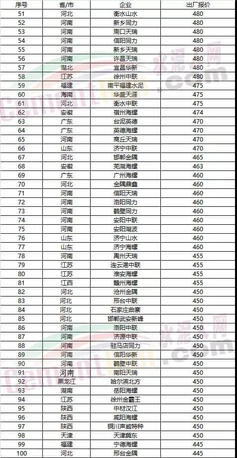各區(qū)域企業(yè)PO42.5散裝水泥出廠報(bào)價(jià)(降價(jià)企業(yè))