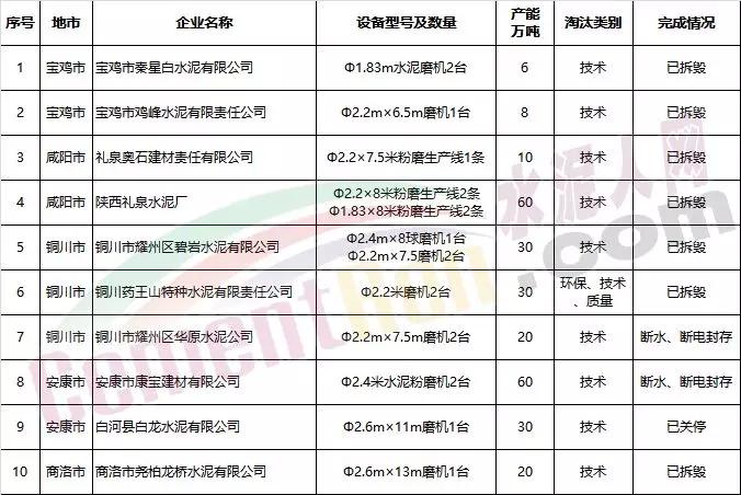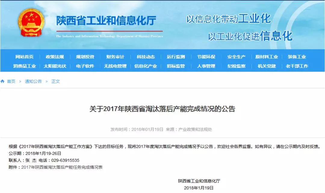 【水泥人網】日前,陜西省工業和信息化廳公告了2017年陜西省淘汰落后產能完成情況。