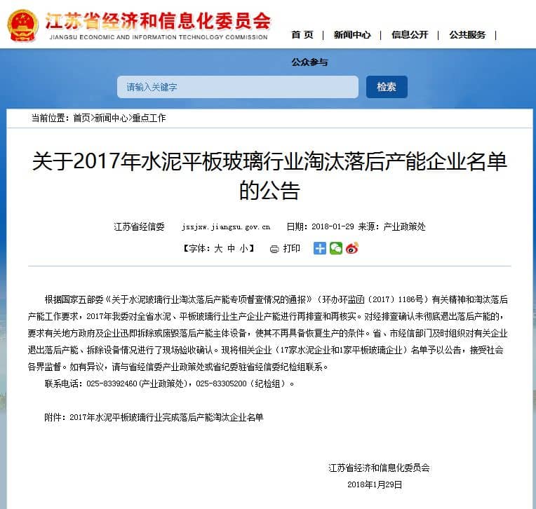 【水泥人網(wǎng)】日前,江蘇省經(jīng)信委發(fā)布關(guān)于2017年水泥平板玻璃行業(yè)淘汰落后產(chǎn)能企業(yè)名單的公告。公告稱(chēng):根據(jù)國(guó)家五部委《關(guān)于水泥玻璃行業(yè)淘汰落后產(chǎn)能專(zhuān)項(xiàng)督查情況的通報(bào)》有關(guān)精神和淘汰落后產(chǎn)能工作要求,2017年江蘇省工信委對(duì)江蘇省全省水泥行業(yè)生產(chǎn)企業(yè)產(chǎn)能進(jìn)行再排查和再核實(shí)。