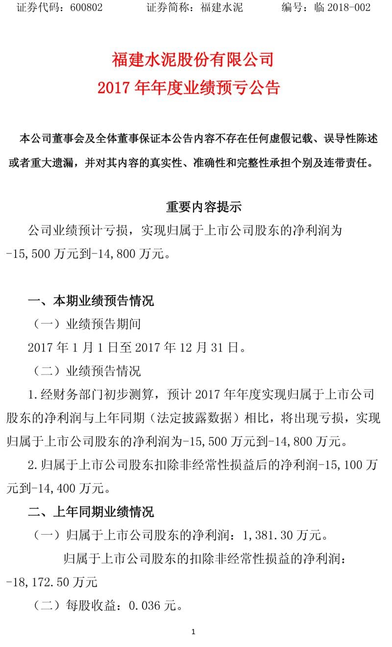 【水泥人網】1月30日,福建水泥(600802)發布業績預告,公司預計2017年1-12月歸屬上市公司股東的凈利潤-1.55億至-1.48億,同比變動-1222.13%至-1171.45%,建筑材料行業平均凈利潤增長率為69.21%。