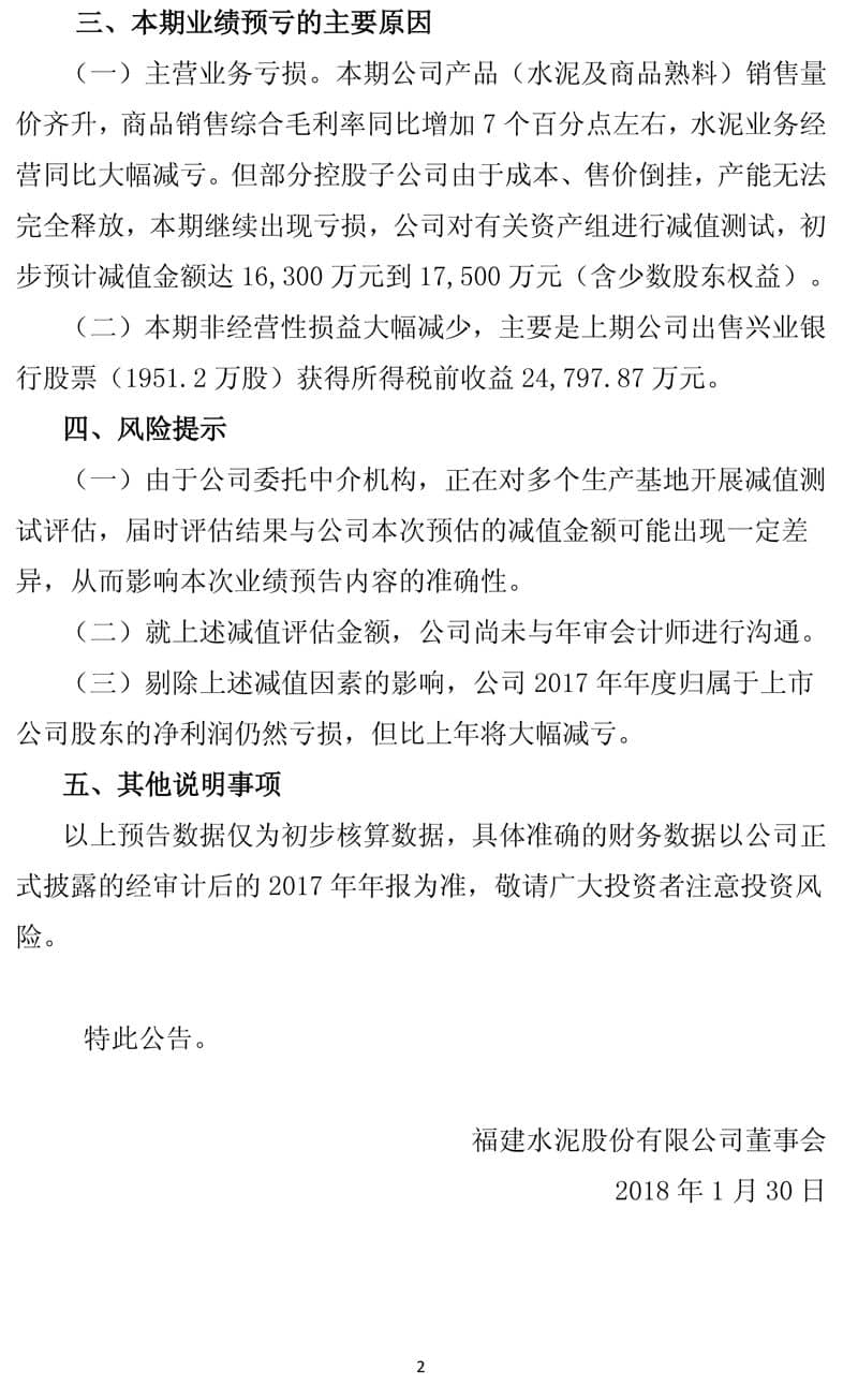 (一)主營業務虧損。本期公司產品(水泥及商品熟料)銷售量價齊升,商品銷售綜合毛利率同比增加7個百分點左右,水泥業務經營同比大幅減虧。但部分控股子公司由于成本、售價倒掛,產能無法完全釋放,本期繼續出現虧損,公司對有關資產組進行減值測試,初步預計減值金額達16,300萬元到17,500萬元(含少數股東權益)。