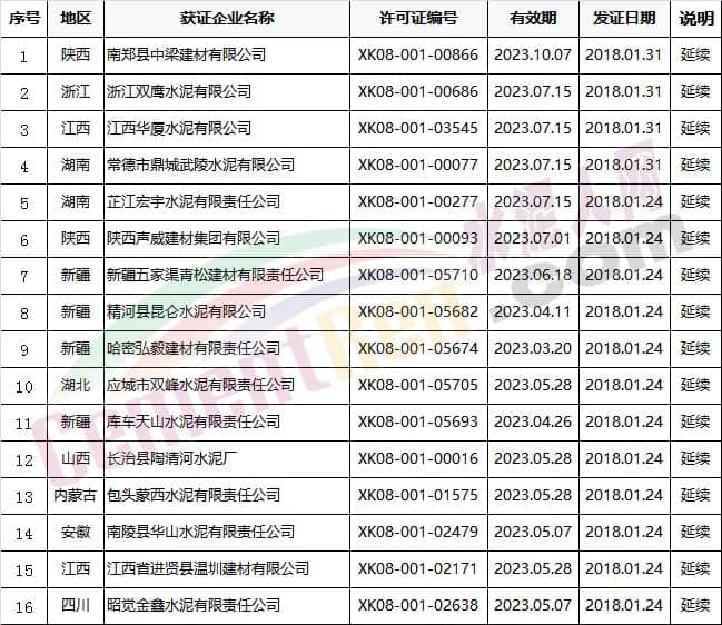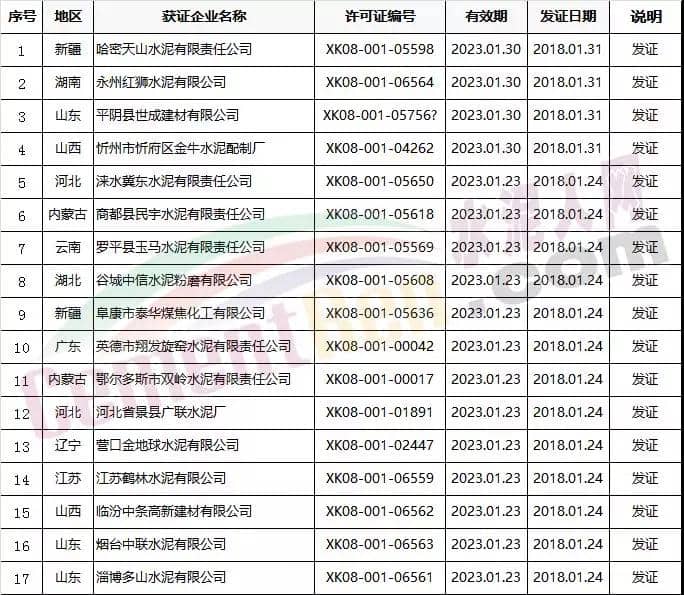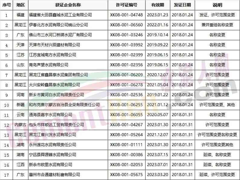 【水泥人網(wǎng)】國家質監(jiān)總局于1月24日、31日分別放發(fā)2018年1月份第四批、第五批水泥企業(yè)生產許可證,共計50家企業(yè)。其中新發(fā)證書17家,涉及變更項目的企業(yè)17家,到期延續(xù)證書的企業(yè)16家。